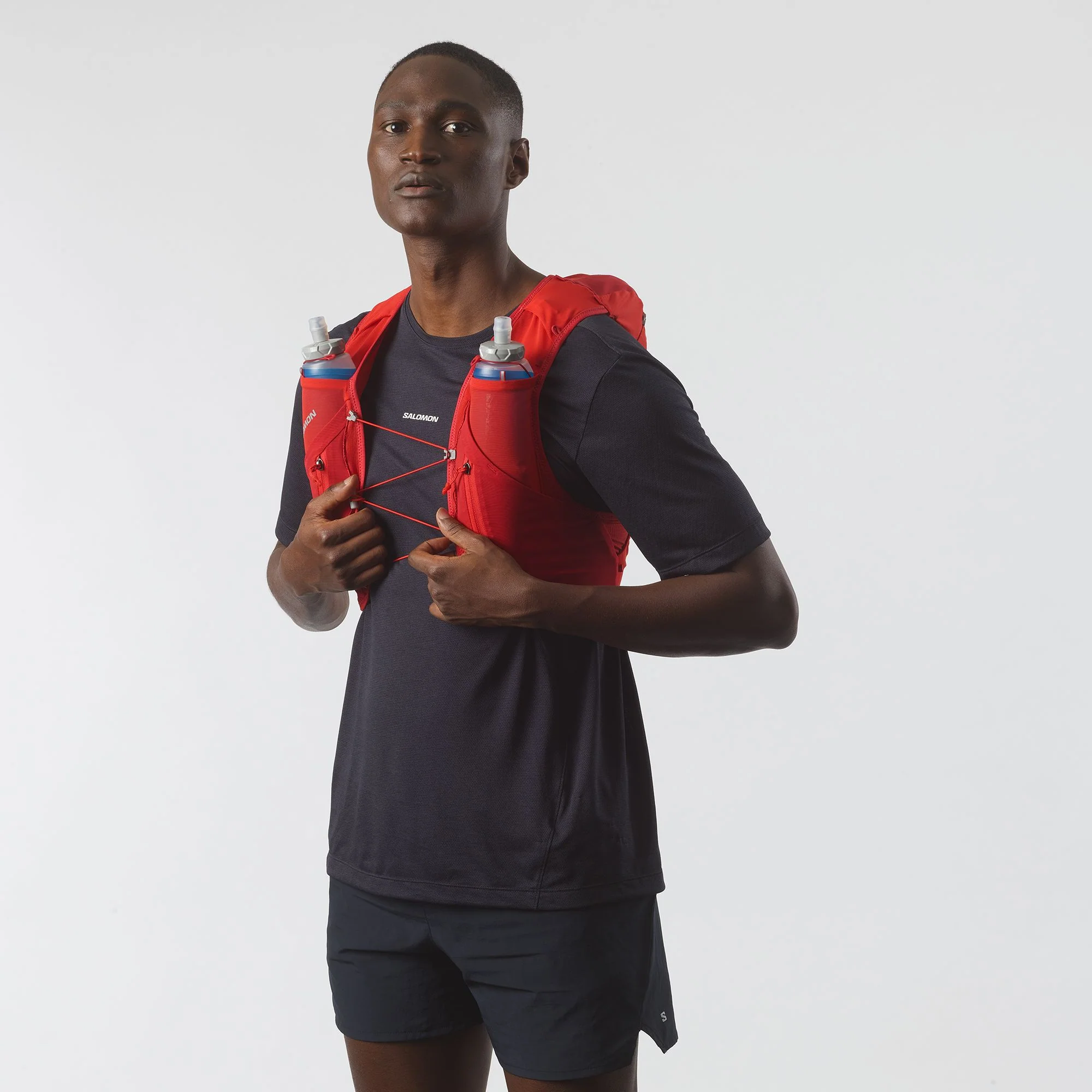 - 2 front flask pockets: Designed to fit Salomon soft flasks, these front pockets limit bouncing. Top elastic loops secure your flasks and keep them ready to drink.